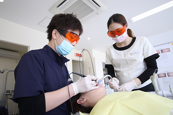 歯周ポケット内にレーザーを照射することにより、歯周病の細菌を減らすことができます。また歯茎の腫れ、出血などの炎症を抑えることができ、治癒を促進する効果があります。患者数に歯ブラシ指導や歯垢、歯垢の除去などとあわせてレーザー治療を行うことで、より効果が高まります。